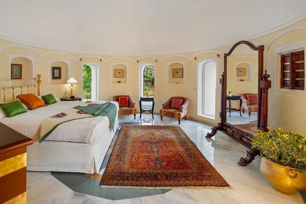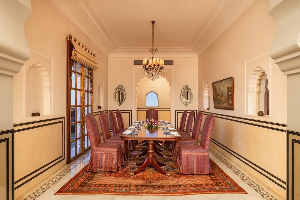 Each of the four bedrooms is designed as a suite-like sanctuary, with generous proportions and views onto the fort’s courtyards or the Aravalli hills. Period-inspired furniture, carved doors, and textiles echo traditional Rajasthani design, balanced by modern amenities expected of an Oberoi stay. The layout lends itself to families, friends, or celebratory groups travelling together, with ample shared spaces – lounges, verandas, terraces – that feel more like those of a private home than a boutique hotel.